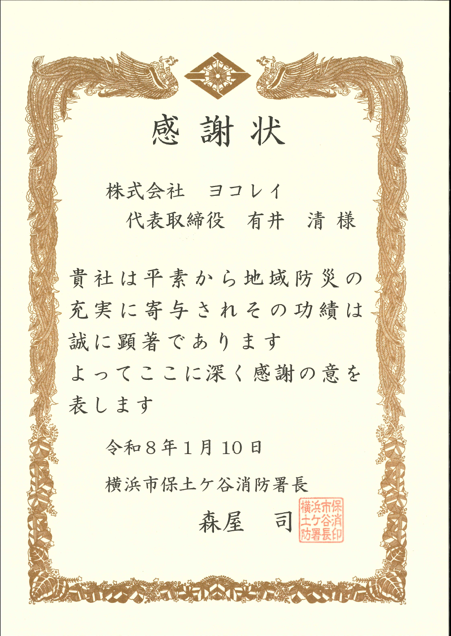 こちらは、社長が消防出初式に参加し、消防署長表彰をいただきました。